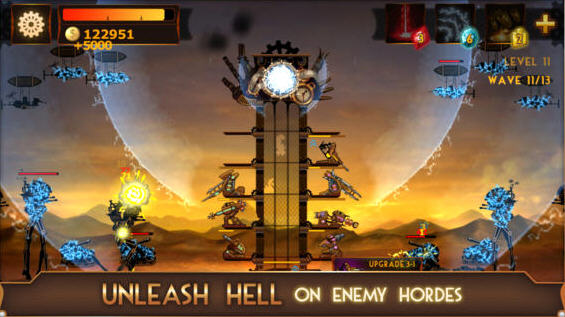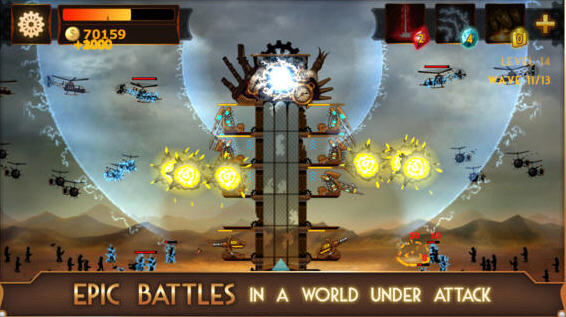 游戏的玩法很简单,我们只需要守护好自己的塔楼,塔楼屏幕两侧会出现大量的敌军部队向你发动攻击,包括步兵,装甲车以及机械虫等等。我们同时也可以升级自己的塔楼高度,购买武器装备来抵御敌军的入侵。比较有意思的是,我们可以滑动改变炮塔的左右位置来狙击不同位置的敌军。我们还可以给自己建造各式各样的武器,如机关枪、特斯拉线圈、加农炮等等充满整齐朋克风格的武器。只要你能想到的基本在游戏里都可以建造出来,如果这些还不是你喜欢的,那么高塔的塔尖还可以对敌人施放威力巨大的攻击,包括毁灭性的激光等等。游戏的剧情很简单,你只需要保护好你塔下的矿产,就能继续雄霸一方,玩家在每场战斗之后可以升级自己的炮塔,在完成任务和艰巨的挑战之后,还能获得塔楼点数作为奖励。