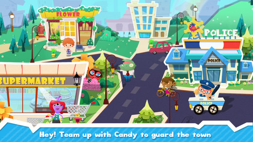 《糖果小镇 Candy’s Town》与其说是休闲作品,还不如说是教育向游戏。游戏的主角是一名名叫Candy的小女孩,玩家利用虚拟摇杆控制她在小镇上行走,但遇到有需要帮助的人,她就会唰地一下变装成为对应的职业,用游戏的方式,为镇民治病、搬运货物、救火、栽种植物等。