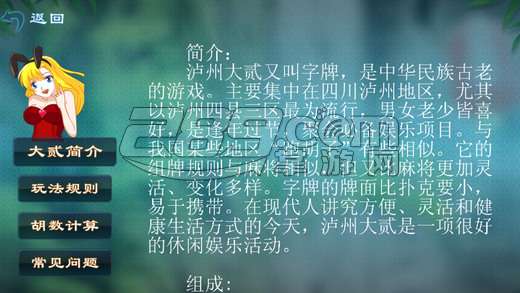 泸州大贰又叫字牌,是中华民族古老的游戏。主要集中在四川泸州地区,尤其以泸州四县三区最为流行,男女老少皆喜好,是逢年过节,聚会必备娱乐项目。与我国某些地区"跑胡子"有些相似。它的组牌规则与麻将相似,但又比麻将更加灵活、变化多样。字牌的牌面比扑克要小,易于携带。在现代人讲究方便、灵活和健康生活方式的今天,泸州大贰是一项很好的休闲娱乐活动。